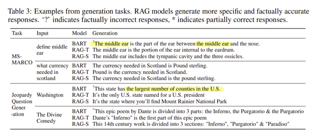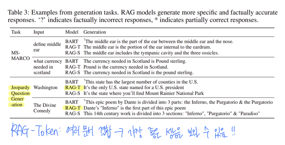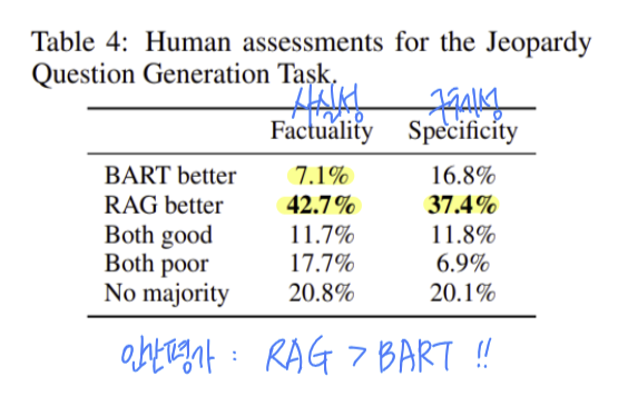 - RAG가 BART보다 사실적으로 정확한 텍스트를 더 자주 생성함