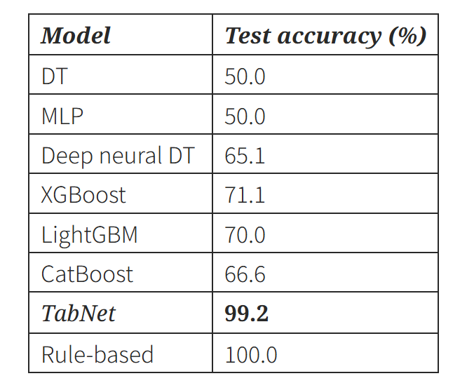 - 실험 결과 : TabNet은 깊은 비선형 처리가 가능하고, instance-wise feature selection으로 인해 overfitting를 방지한다. 이에 복잡한 규칙 구조를 잘 학습하게 되고, 높은 성능을 보인다.