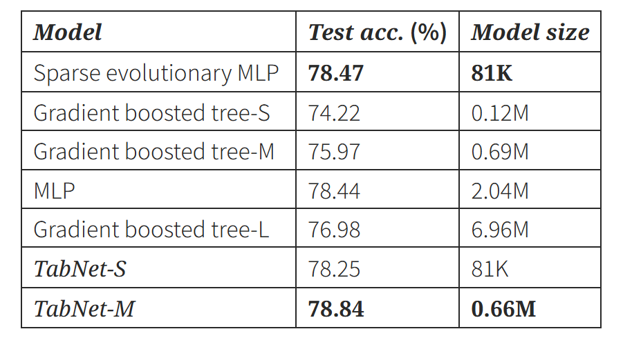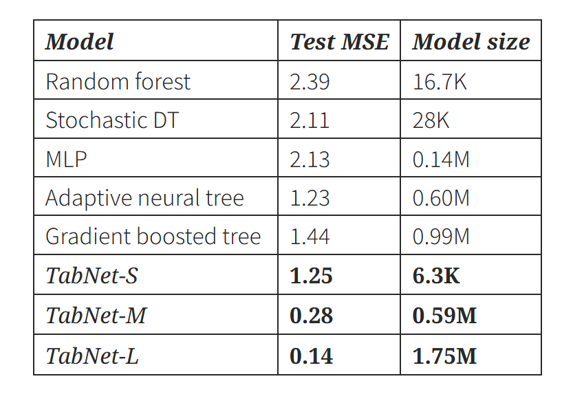 - TabNet은 더 적은 파라미터로 비슷하거나 더 좋은 성능을 보인다.