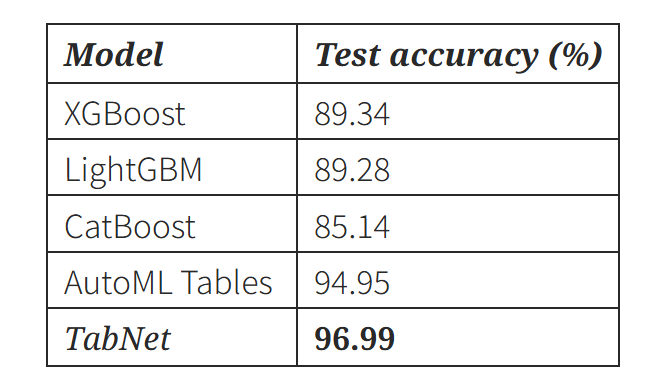 - TabNet은 기존 트리 기반 모델보다 성능이 우수하다. 특히, 단일 모델임에도 불구하고, 복잡한 AutoML ensemble보다 더 높은 성능을 보인다.