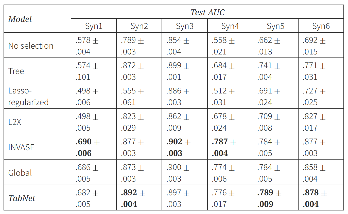 - Syn4에서 조건에 따라 다른 feature를 선택해 TabNet이 정확히 instance-wise 선택을 수행하는 것을 볼 수 있다.