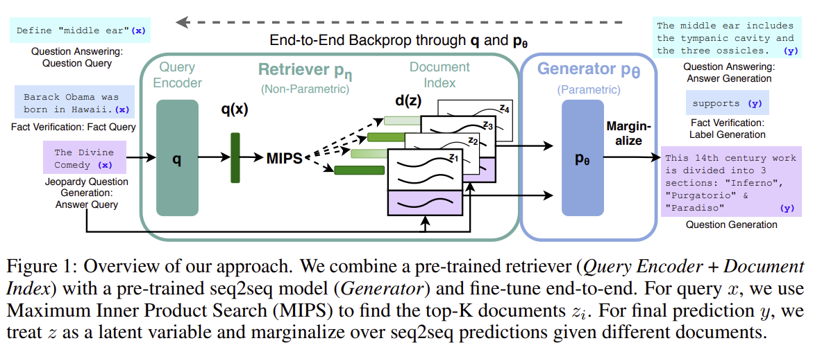 1. IntroductionRAG의 등장 배경 기존 모델 (ex. GPT, BERT, T5, BART 등)사전학습된 신경 언어 모델 ( 외부 문서나 지식베이스를 실시간으로 검색하지 않아도,학습된 파라미터 속에 간접적으로 저장된 지식을 기반으로 답변을 생성하는 모델 )문제쉽게 확장하거나 수정할 수 없음예측 결과에 대한 명확한 근거 제공 어려움사실이 아닌 내용을 생성할 수 있음 부분적 해결책 (ex. REALM, ORQA)파라메트릭 메모리(모델의 파라미터 안에 저장된 지식)와 논파라메트릭 메모리 (외부 문서를 검색해서 활용하는 지식)를 결합한 하이브리드 모델대표 모델 : REALM, ORQA ( 마스킹 언어 모델 : 파라메트릭 모델 + 미분 가능한 검색기 : 논파라메트릭 모델)특징지식 수정, 확장 가능 (외..